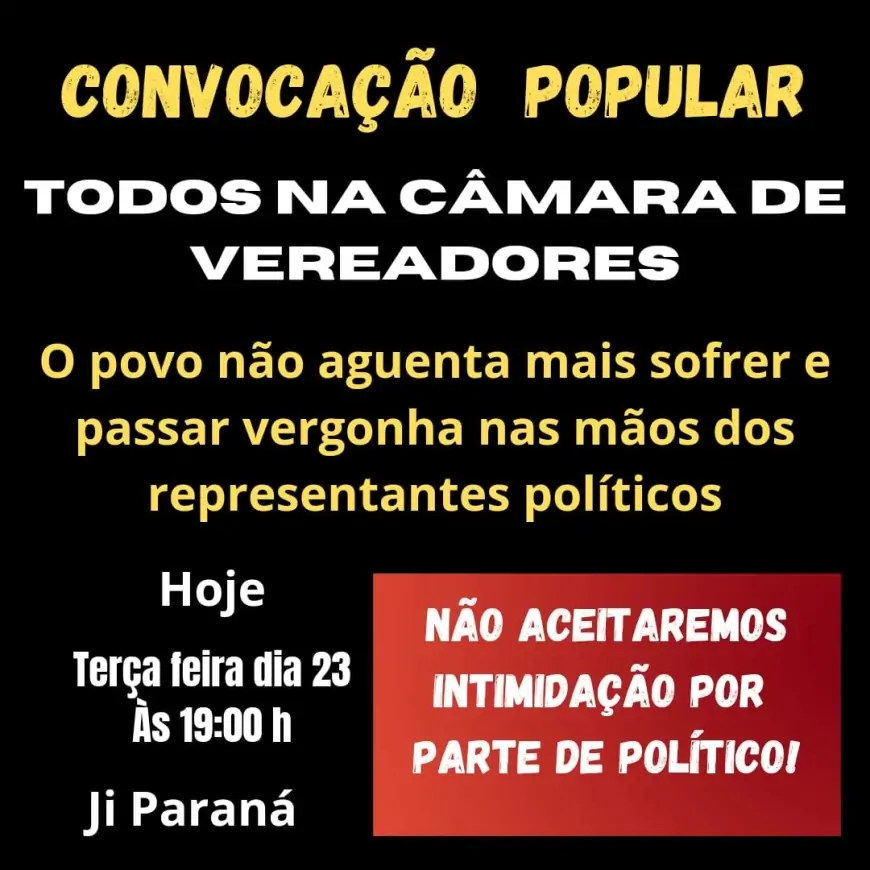 Há dias circula nos grupos de WhatsApp e redes sociais um convite para uma manifestação pacífica na Câmara de Vereadores de Ji-Paraná, marcada para esta terça-feira (23).