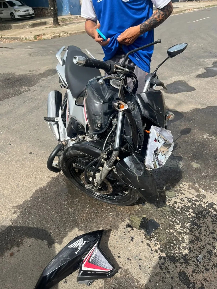 Apesar da força da batida — que deixou a frente da moto destruída e provocou danos consideráveis na lateral do carro — não houve feridos graves. O motociclista sofreu escoriações nas pernas e no joelho, mas estava consciente e sentado no local após o ocorrido.