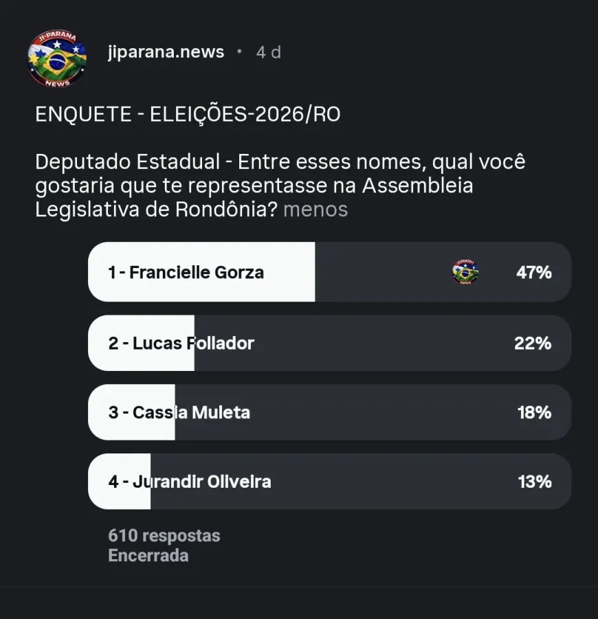 A vice-prefeita Francielle Gorza - PSD, de Nova Brasilândia d'Oeste (região da Zona da Mata) participou de uma enquete com duração de três dias, tendo 610 pessoas que opinaram, concorrendo com nomes relevantes, entre eles, a ex-deputada estadual Cassia Muleta de Jaru, e o atual vereador de Ariquemes, Lucas Follador, que também foi deputado federal.