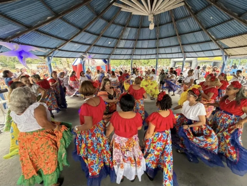 Um dos momentos mais especiais da festa foi a apresentação de dança do grupo folclórico formado por senhoras que dançam carimbó. Com muita energia, cores e tradição, o grupo encantou o público presente e protagonizou um espetáculo à parte, arrancando aplausos e valorizando a cultura regional.