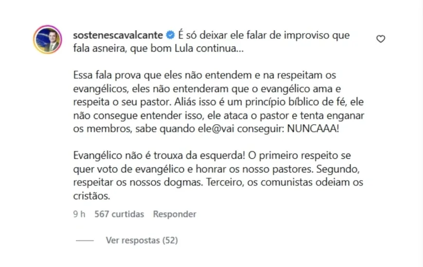 Em publicação nas redes sociais, Sóstenes afirmou que Lula não entende o público evangélico e atacou o modo como o presidente se referiu ao tema.