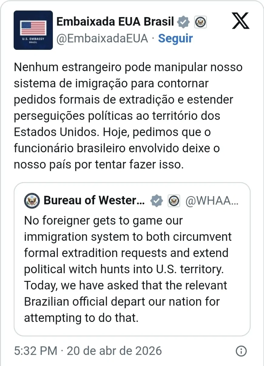 — Nenhum estrangeiro pode manipular nosso sistema de imigração para contornar pedidos formais de extradição e estender perseguições políticas ao território dos Estados Unidos. Hoje, pedimos que o funcionário brasileiro em questão deixe o país por tentar fazer isso — diz o texto.